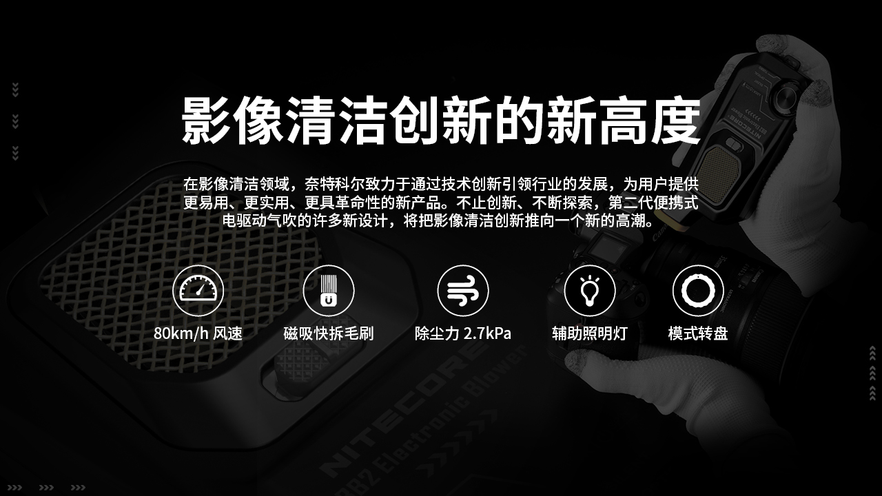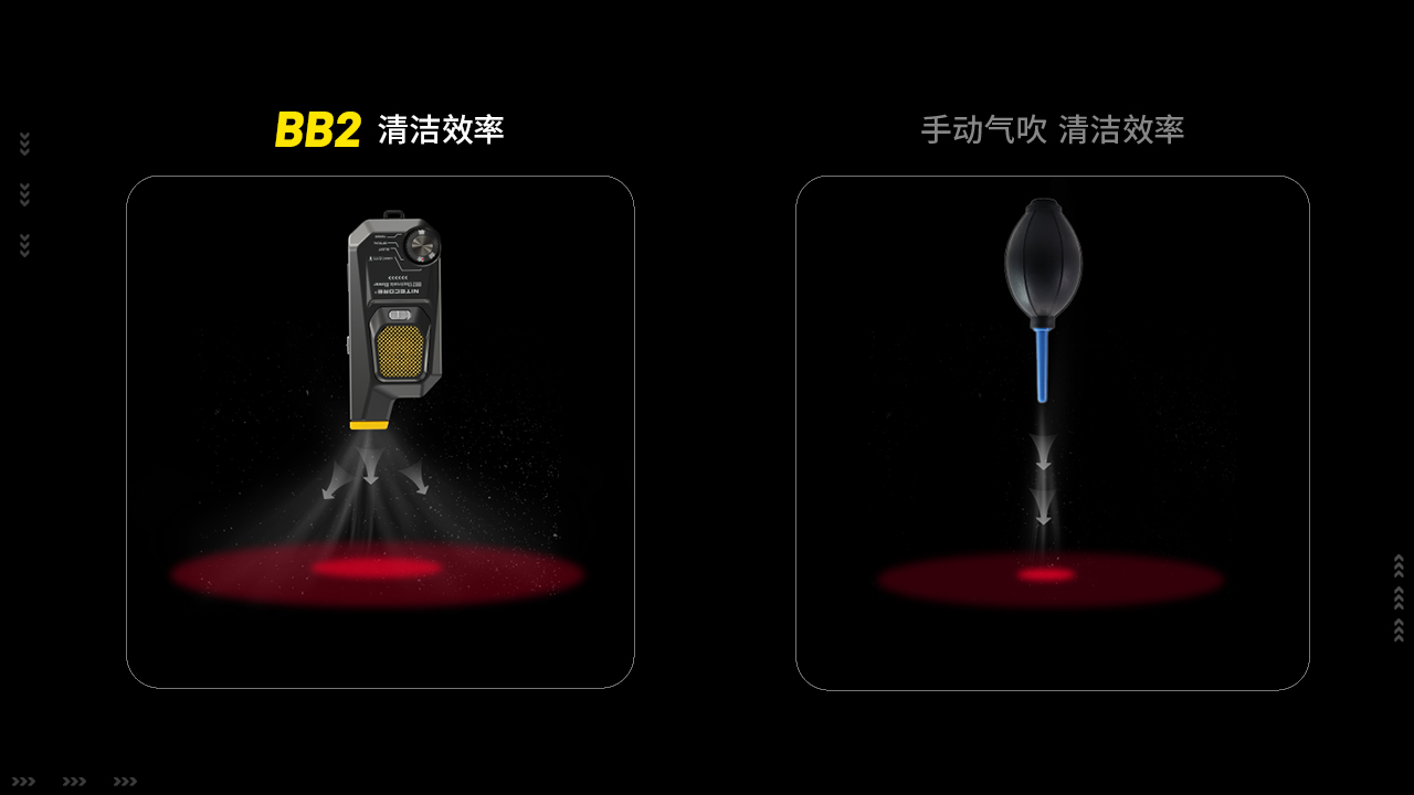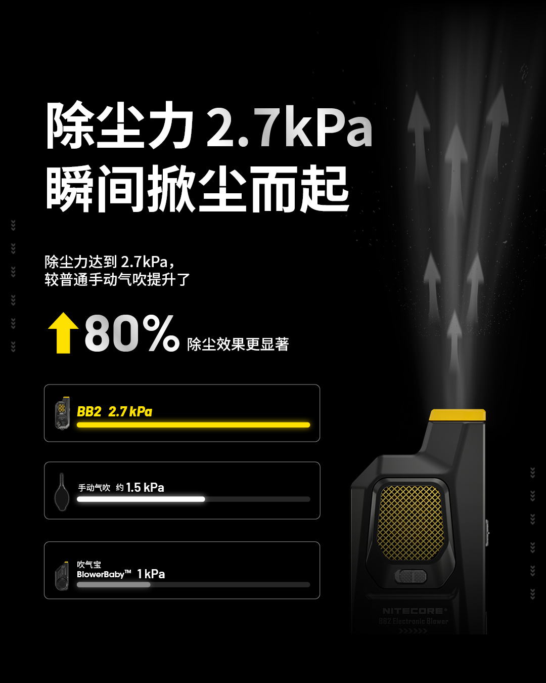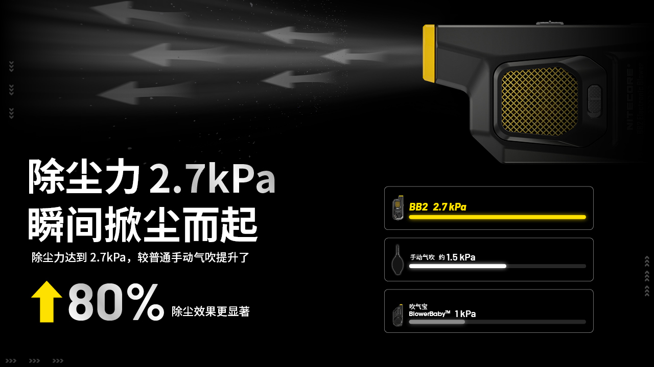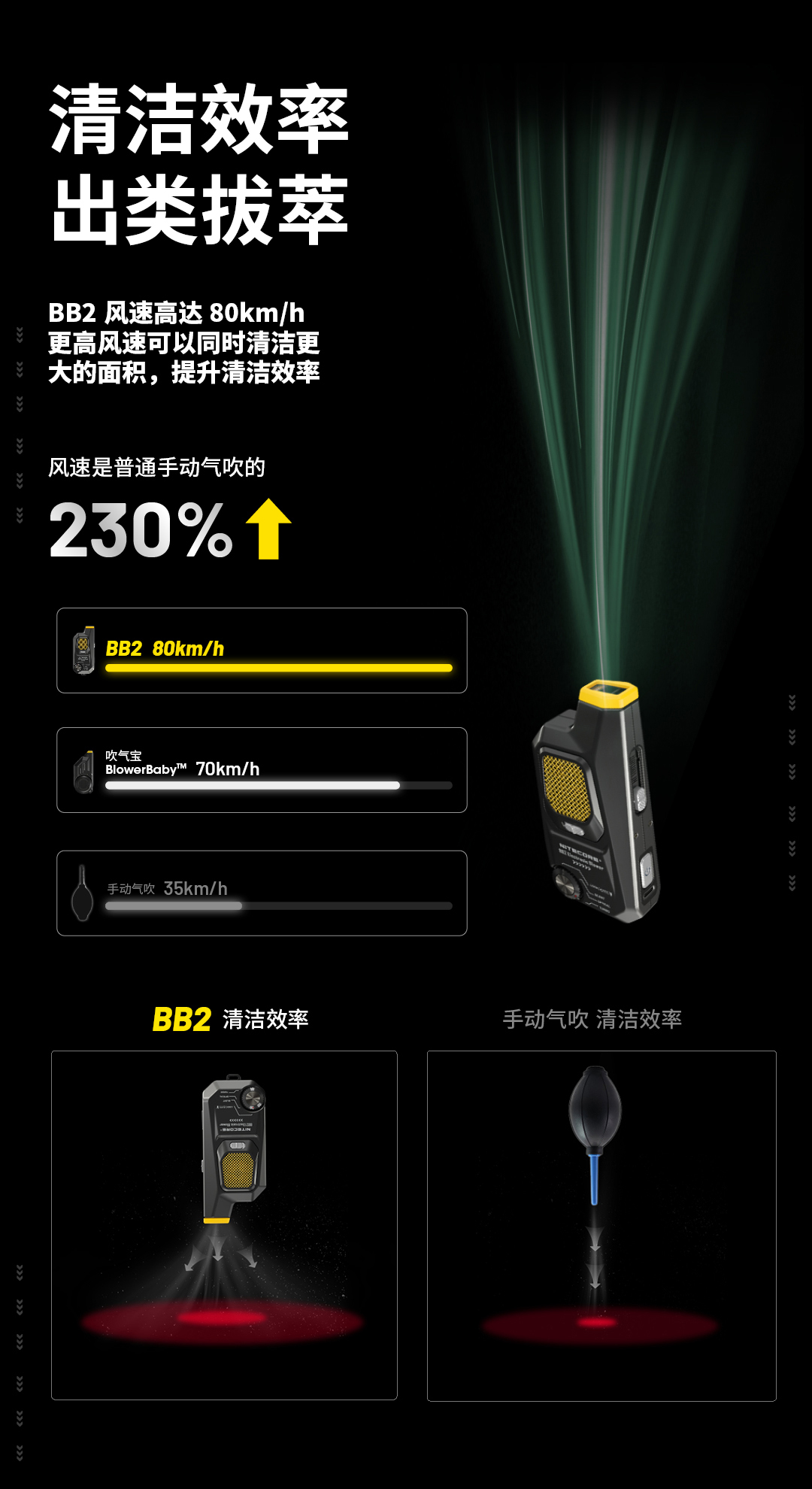 奈特科尔BB2吹气宝,搭载33.6W高功率电机、流体动力学风道与42毫米一体化叶轮,除尘力高达2.7kPa,风速提升至80km/h,自带辅助照明灯与磁吸快拆毛刷,吹、照、扫三位一体。