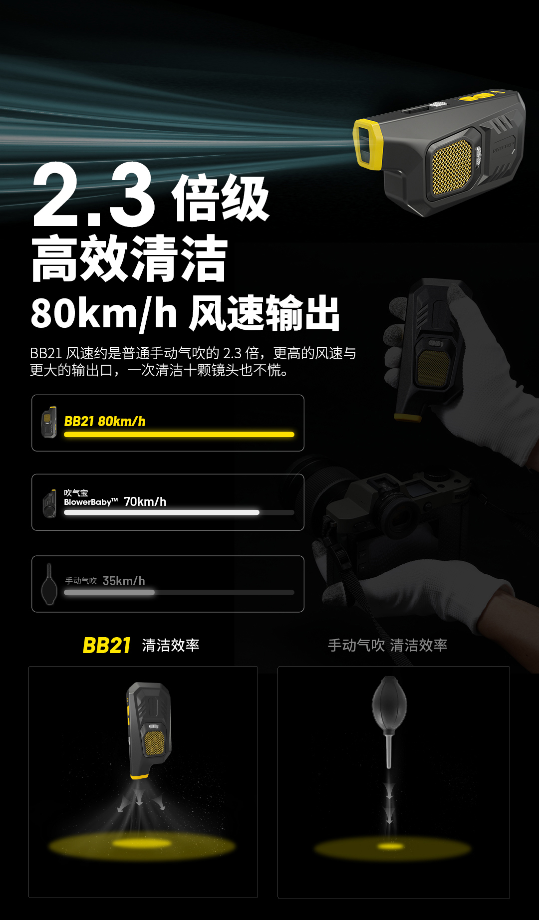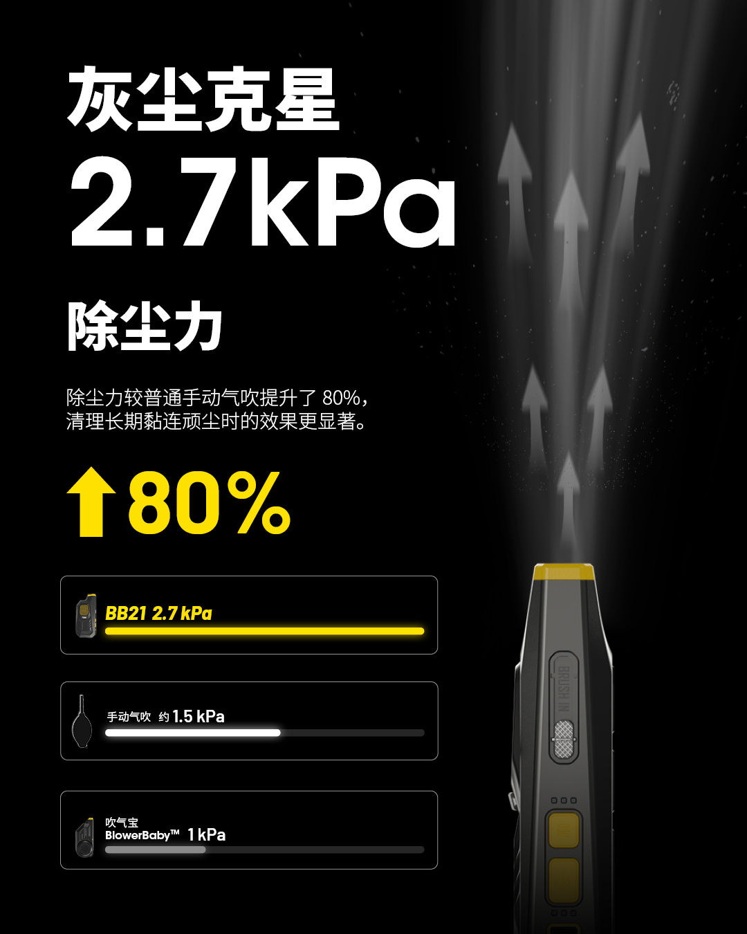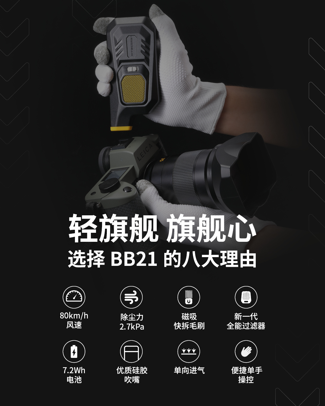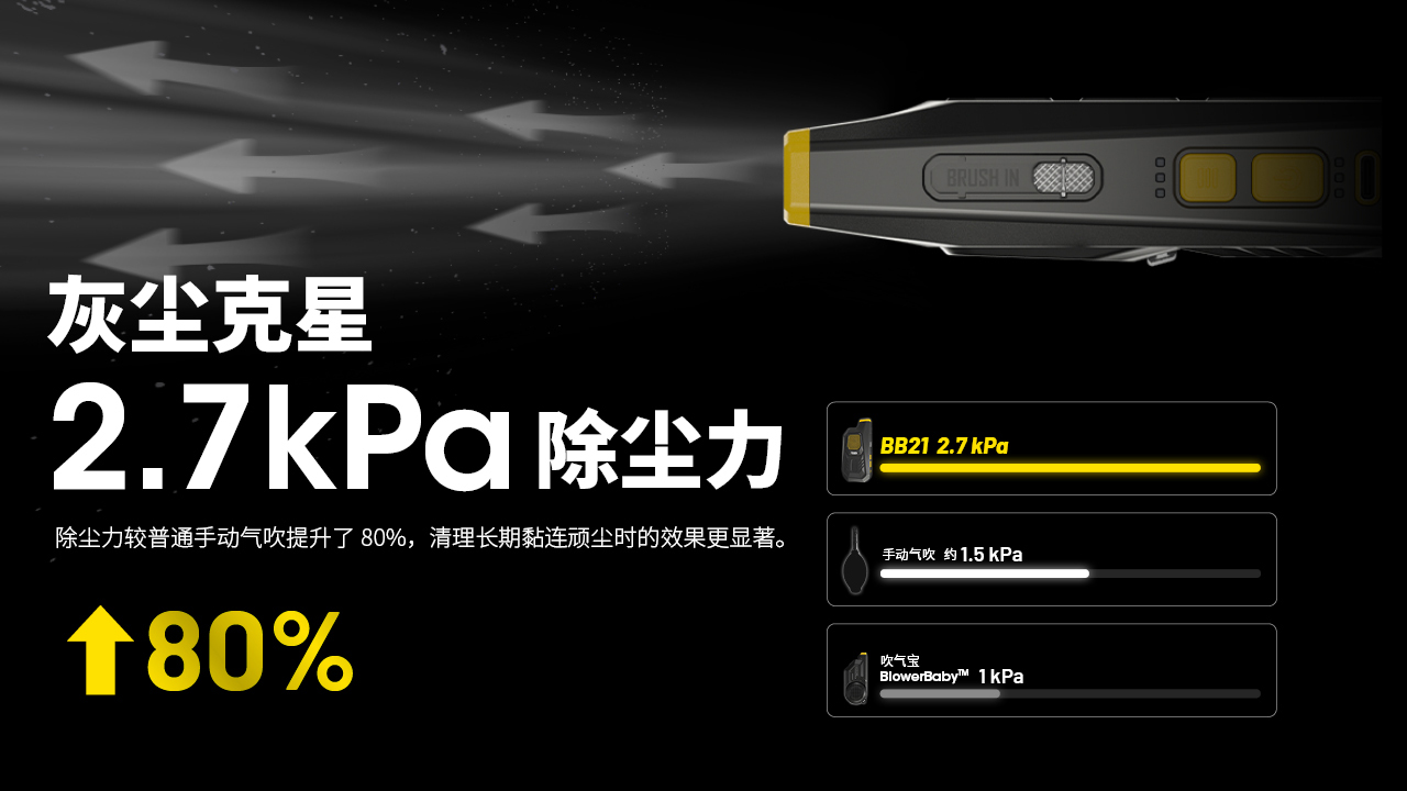 奈特科尔BB21吹气宝,搭载33.6W高功率电机、流体动力学风道与42毫米一体化叶轮,2.7kPa除尘力、80km/h风速输出,人体工学按键布局,乐享单手清洁的乐趣。